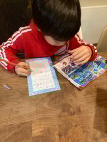 息子君のクリスマスプレゼント🎄は既にサンタさんにお願い済みのはずが、突然前夜にサンタに手紙を書き始める息子君…しかもトイザらスのカタログ見てるし……字汚いし…( ̄ー ̄)